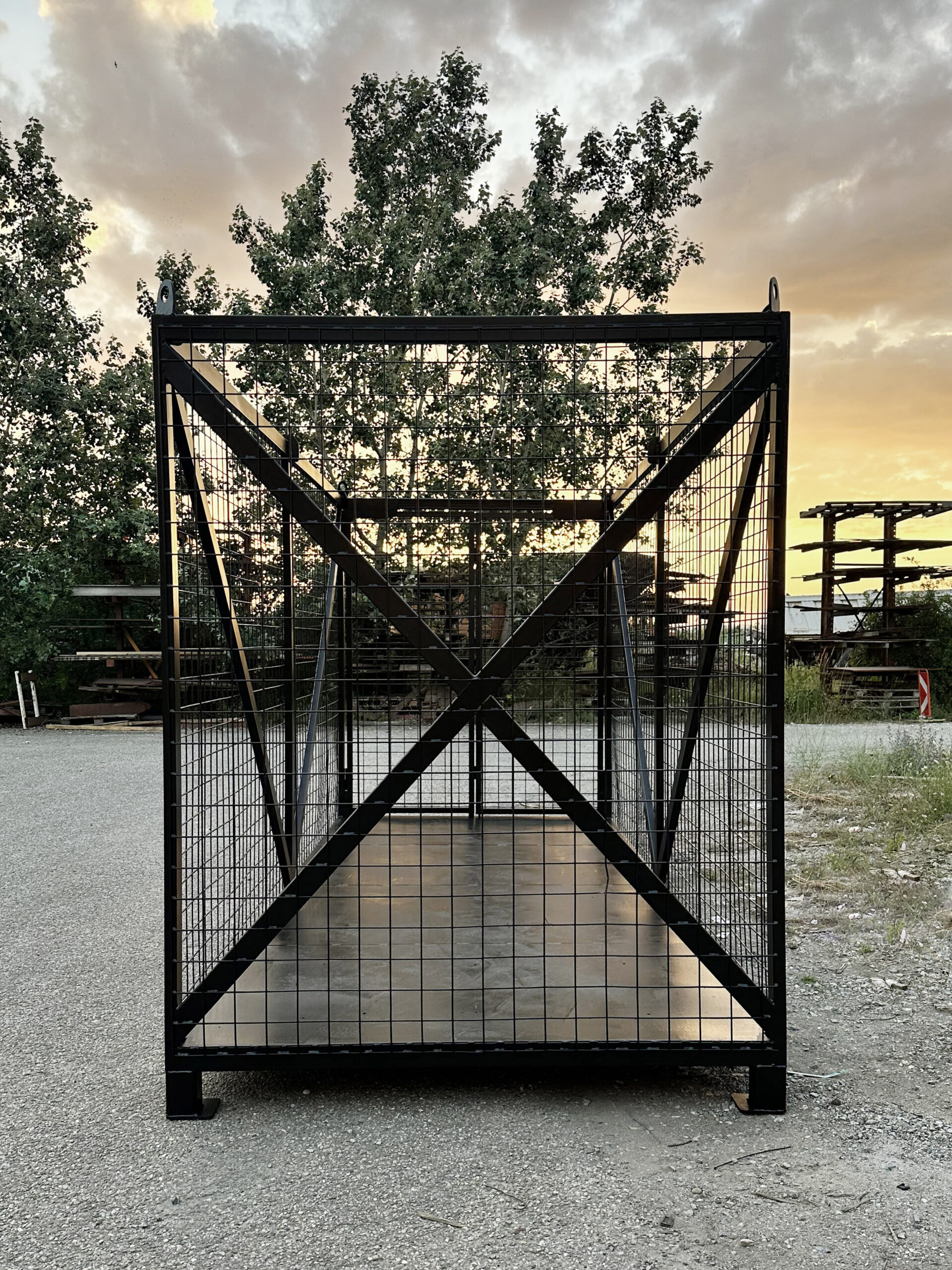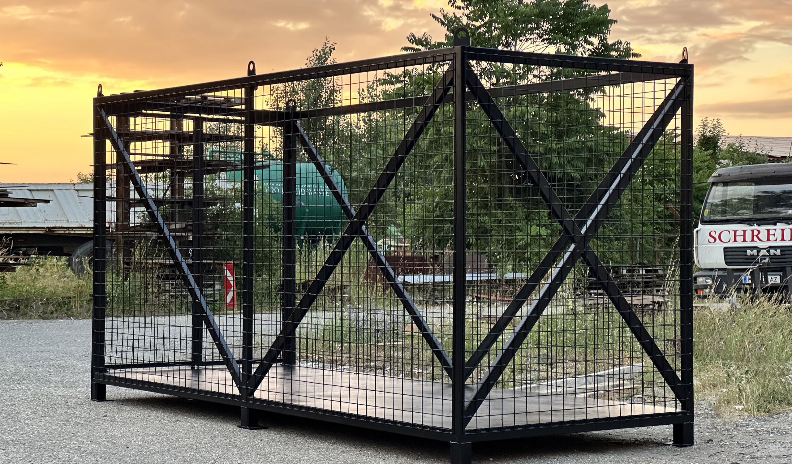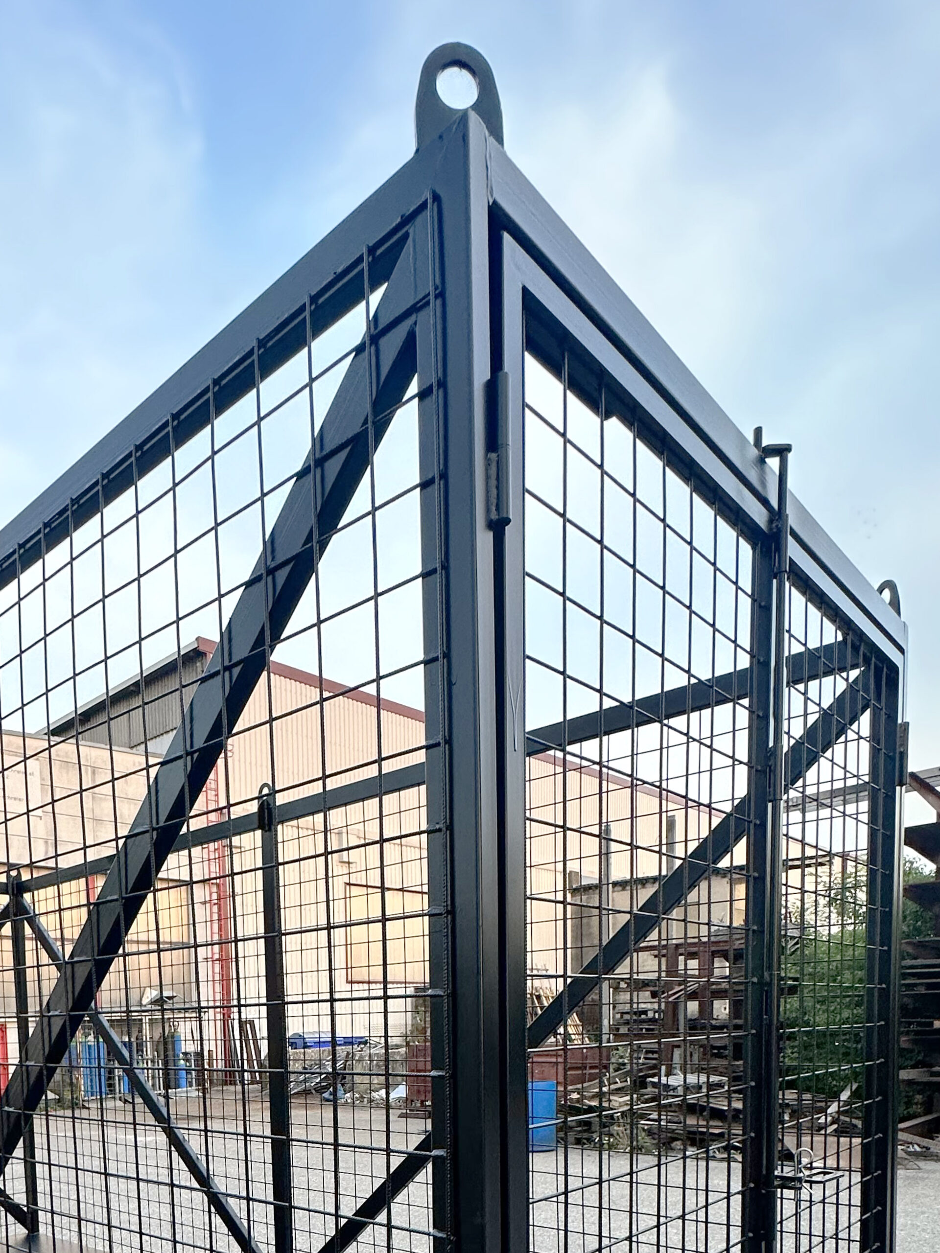 Der Gittercontainer aus verwindungssteifem Formrohr mit Seitenwänden aus stabilen Gittermatten wurde nach den spezifischen Anforderungen des Kunden gefertigt. Die stirnseitige Doppelflügeltür ermöglichte effizientes Be- und Entladen, während integrierte Kranösen ein sicheres Heben und Handling gewährleisteten. Der geschlossene Blechboden schützte zuverlässig vor dem Durchfallen von Kleinteilen und erhöhte die strukturelle Stabilität bei Lasten. Die Oberflächenbehandlung erfolgte durch Grundierung und Lackierung, um Korrosionsschutz zu gewährleisten und die Langlebigkeit des Containers sicherzustellen. Somit kombinierte das maßgeschneiderte System technische Präzision, Funktionalität und Sicherheit für Lagerung und Transport.